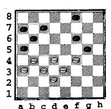 II. 22. gf4! ef6 23. cd4 fg5 24. d:b6 a:c7 25. fe5! de7 26. ef6 ed6 27. fe7 d:f8 28. hg3 fe7 29. ed4 ef6 30. dc5 fe5 31. ab4 gf4 32. cd6 f:h2 33. d:b8 ef4 34. b:g3 h:f4 35. bc5 fg3 36. fe3 gh2 37. cb6 c ничьей, В.