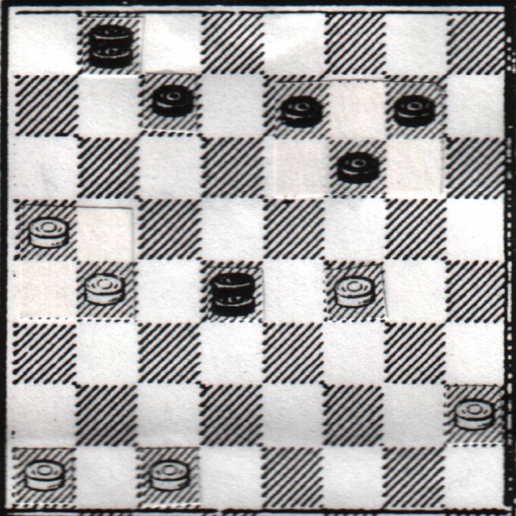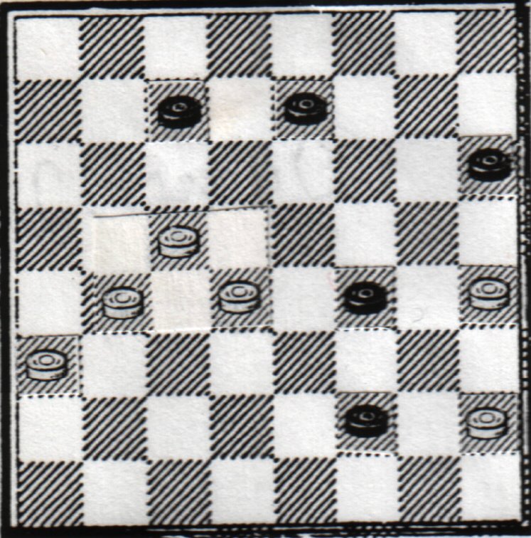 Наверное, и эту позицию можно отнести к шашечным парадоксам. Черная шашка f2 находится па пороге превращения в дамку: всего один шаг до поля е1 или g1. У белых нет способа воспрепятствовать этому, но выигрыш все же есть. Найдите его!